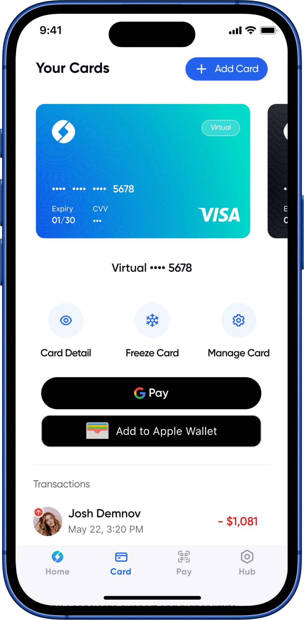 Yes! Both virtual and physical cards can be added to Apple Pay and Google Pay for tap-and-go convenience.